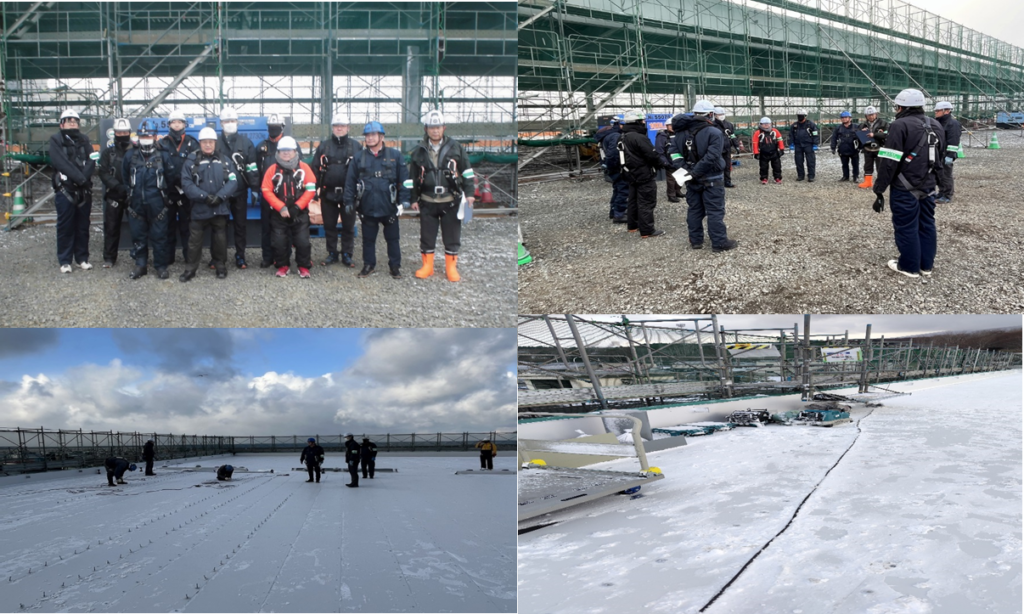 当現場は、漁港の中の建物で廻りは海、当日は気温は氷点下で風が非常に強く、又足元は雪が残り非常に滑りやすい環境での施工でした、
