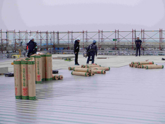 当日は、屋根工事としてデッキ上木毛板張り作業が行われておりました。