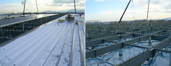 冬季の施工から折板葺きは、上下弦材共仕上げなければ降雪に伴う除雪作業が増えます。石狩工業地区は、日本海の強風と豪雪地帯から天候不順な気候の中で、荷上げ・折板葺き・グラスウール敷き作業を行っておりました。パトロ-ル後の反省会で、強風下での荷上げ作業の中止を会社側が指摘しておりましたが、多くの作業員の賃金補償や工程を考えると、職長の求められる判断は、深刻なものと考えられます。バトロ-ル中に、作業員が降り積もった雪で転ぶ姿を二度ほど見ましたが、折板上を通行するのは危険そのものであり、凍結しているH鋼での溶接作業やタイトフレ-ムの配送も危険が付きまといます。日没が早く、気温も下がり、屋根上の凍結が急速に始ります。冬季は限られた条件下の作業となることから、施工優先で機械・資材・仮設等の手配を周到に準備することが、安全・施工や原価管理に繋がるものと思いますが、上下弦材の成型機のコマ取替えの時間ロスを作業員が指摘しておりました。また、昇降用階段のステップが凍結し、転倒の危険性も指摘されましたが、その除去作業や各所の除排雪作業が明確な費用負担が示されずに曖昧な結果になることは、安全確保に反する状態が続くことになります。降り続く雪や氷結の除去作業は、専属の人夫に任せ、作業員が施工に専念できる体制にすることが、安全作業に繋がることになりますが、冬季の施工は多様な問題が発生します。それらのことを、未然に現場担当者が元請と協議される体制が安全作業になるものと思います。