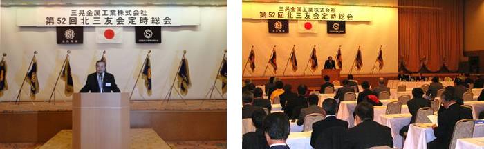 北三友会第52回定時総会が3月15日定山渓温泉ホテルミリオ-ネで来賓、会員、三晃金属工業職員など130人出席の下に開催した。総会に先立ち「東北関東大地震」の被害者に対し黙祷を捧げ、総会と式典を行った。千葉会長は「被災された方々に心よりお見舞いを申し上げますと共に、多くの行方不明者の一刻も早い救出をご祈念します。多くの犠牲者や被災者のことを考えると定時総会を開催するか否かを慎重に審議したところですが、日程のこともあり、晴れがましい総会・式典を慎み、粛々と開催するべきとの方針としました。また、会場内に義援金箱を用意しておりますので皆様のご協力をお願いします。